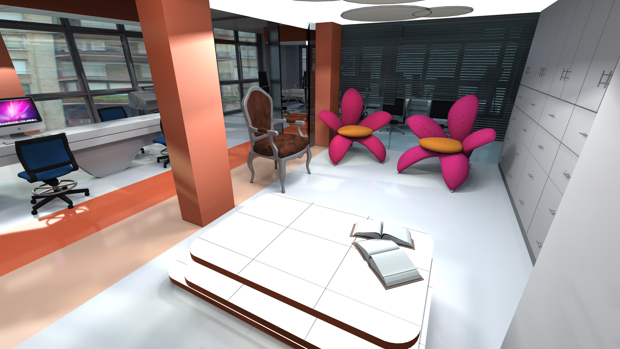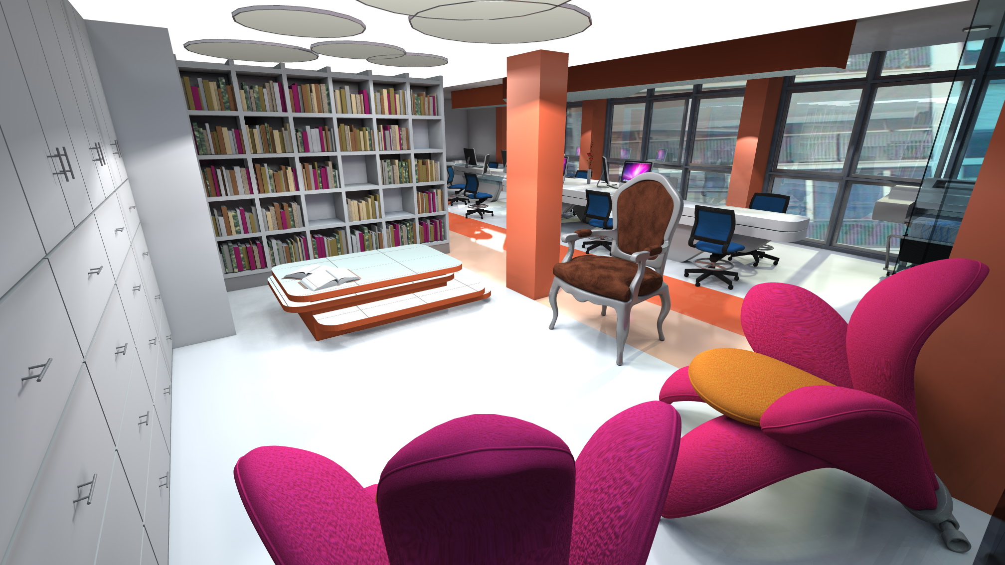 El sector de lectura, con un sofá espectacular con formato de flor gigante, invita a estudiarse todos los libros de arquitectura de la biblioteca.