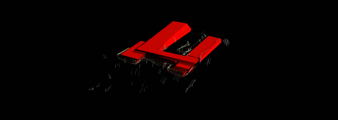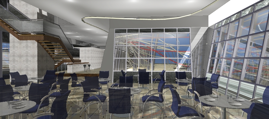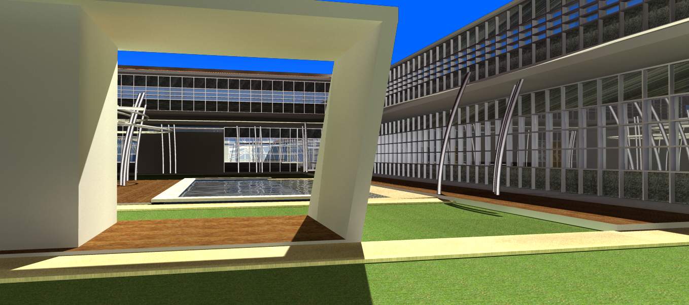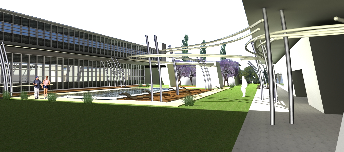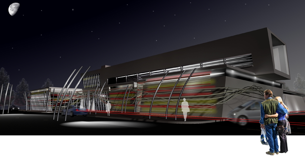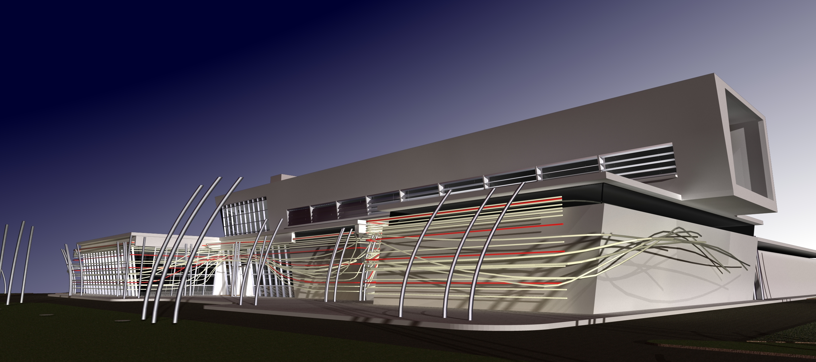 El Proyecto para el concurso del Hotel COSEGA, en Gral Acha, La Pampa, se basó en la idea del espacio infinito, cuyos elementos, en medio de la nada, son sólo las líneas de las luces de los automóviles dejadas por su paso en la noche interminable pampeana. En su concepto de espacio casi sideral, delgadas líneas rojas y blancas amarillentas dejando una huella en la retina de la gente.