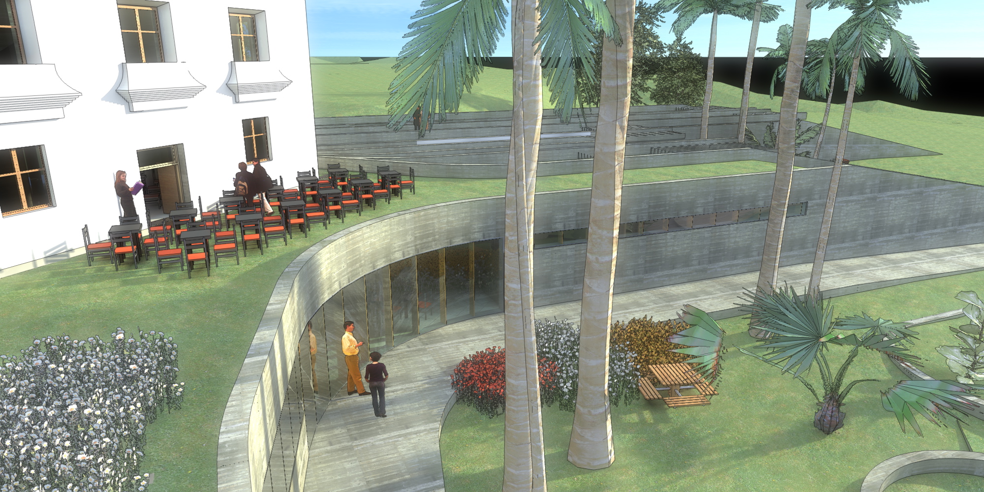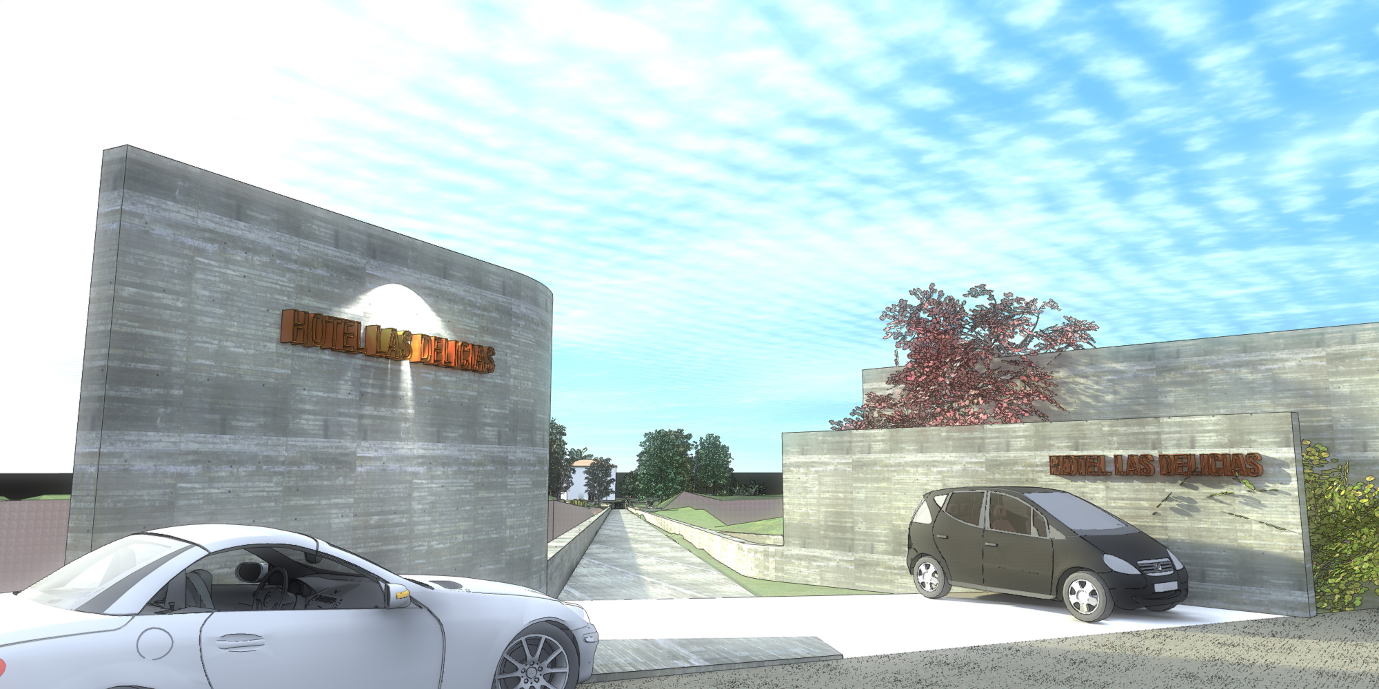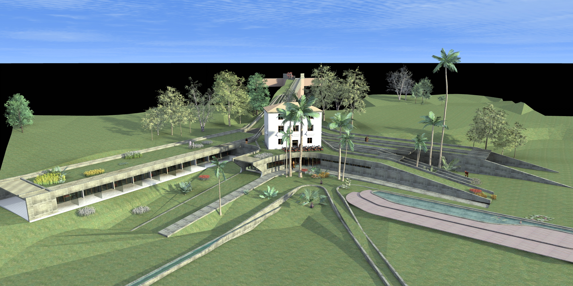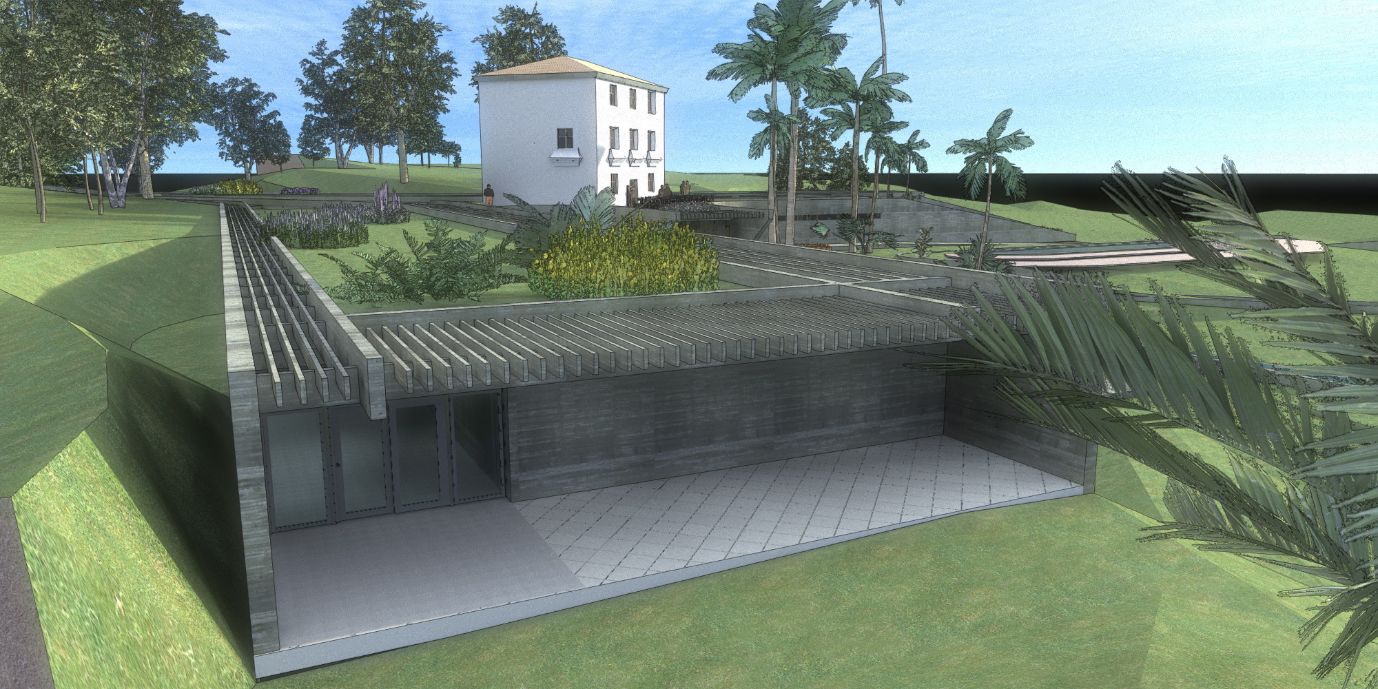 Las cubiertas son verdes, esto permite mantener un clima interior confortable con muy poco consumo energético. Estas cubiertas verdes ocultan y camuflan el hotel, evitando una intervención agresiva en el entorno, intentando armonizar, y casi desaparecer en el paisaje. Sólo quedarán a la vista las líneas de muros-vigas-pérgolas generando sutileza.