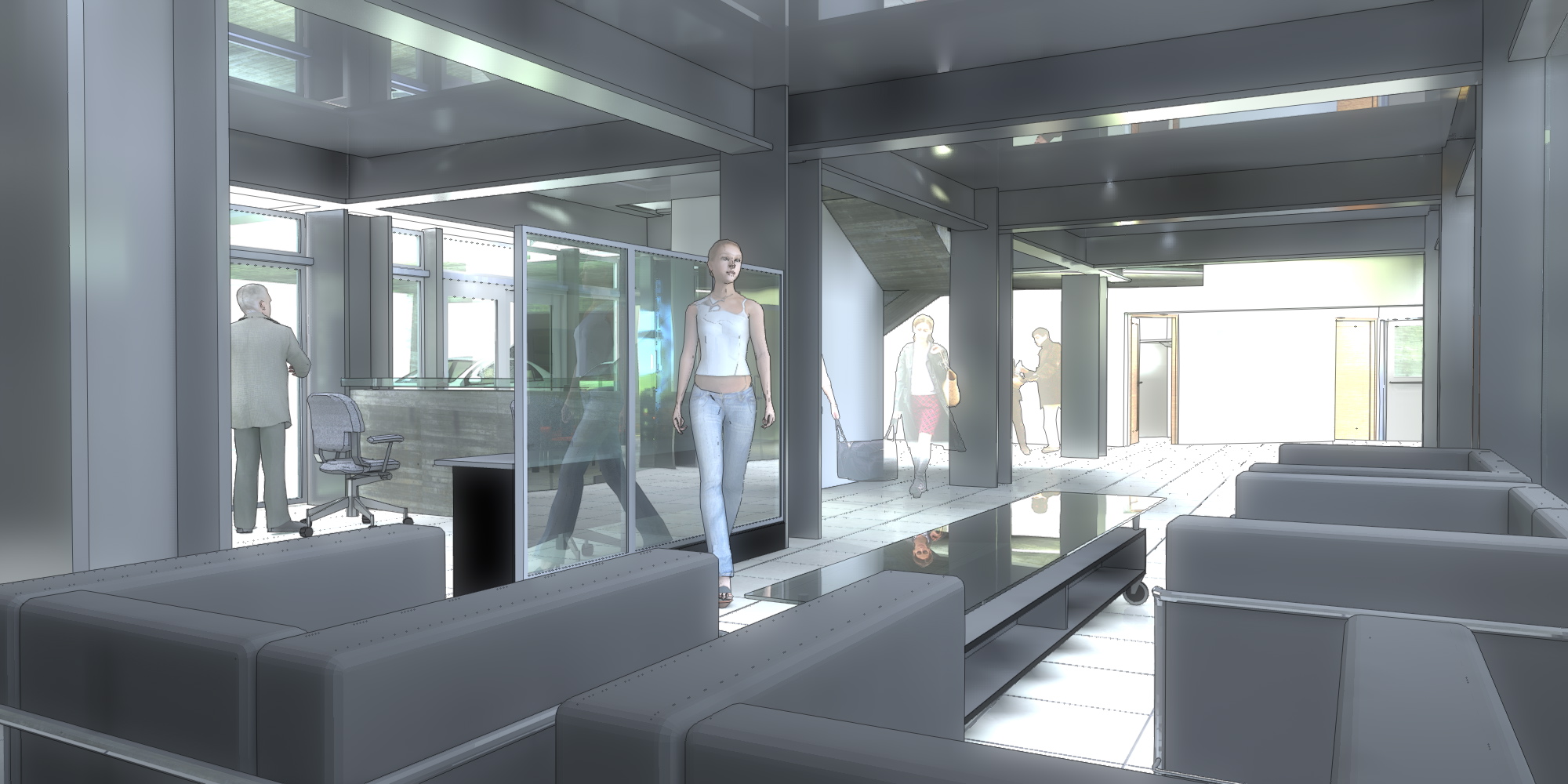 El edificio original quedará apoyado en pilares metálicos, y alrededor de los muros externos se deja una entrada de luz mediante un piso de vidrio que ermite mientras se recorre el exterior,
