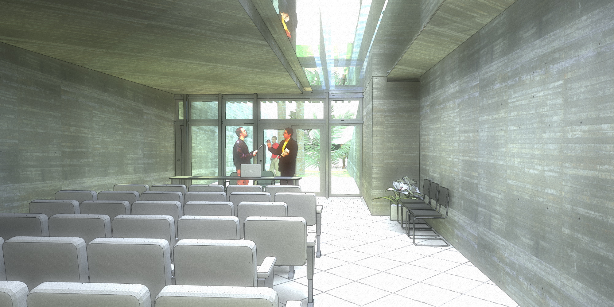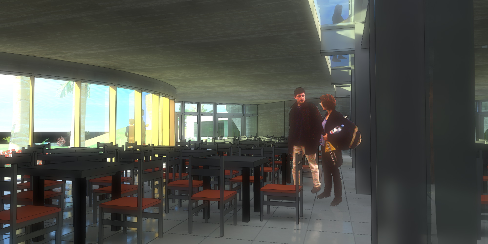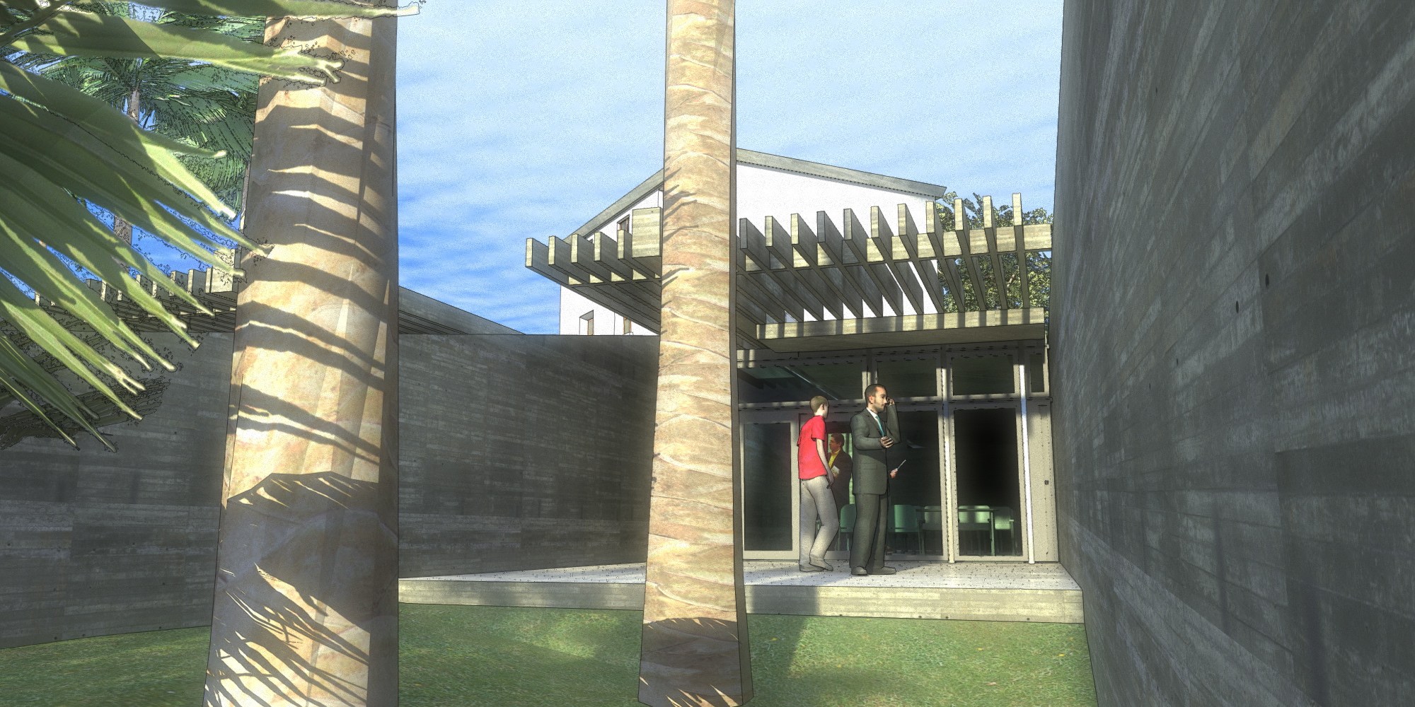 Se generó un sistema de pérgolas, vigas y muros-pérgolas que en realidad son líneas multifuncionales. Estas lineas desde arriba son muretes bajos, entre los que se puede caminar, y saltar, y recorrer, mientras que desde abajo, generan entradas de luz a los pasillos de las zonas de dormitorios, y o pérgolas que tamizan el fuerte sol murciano.