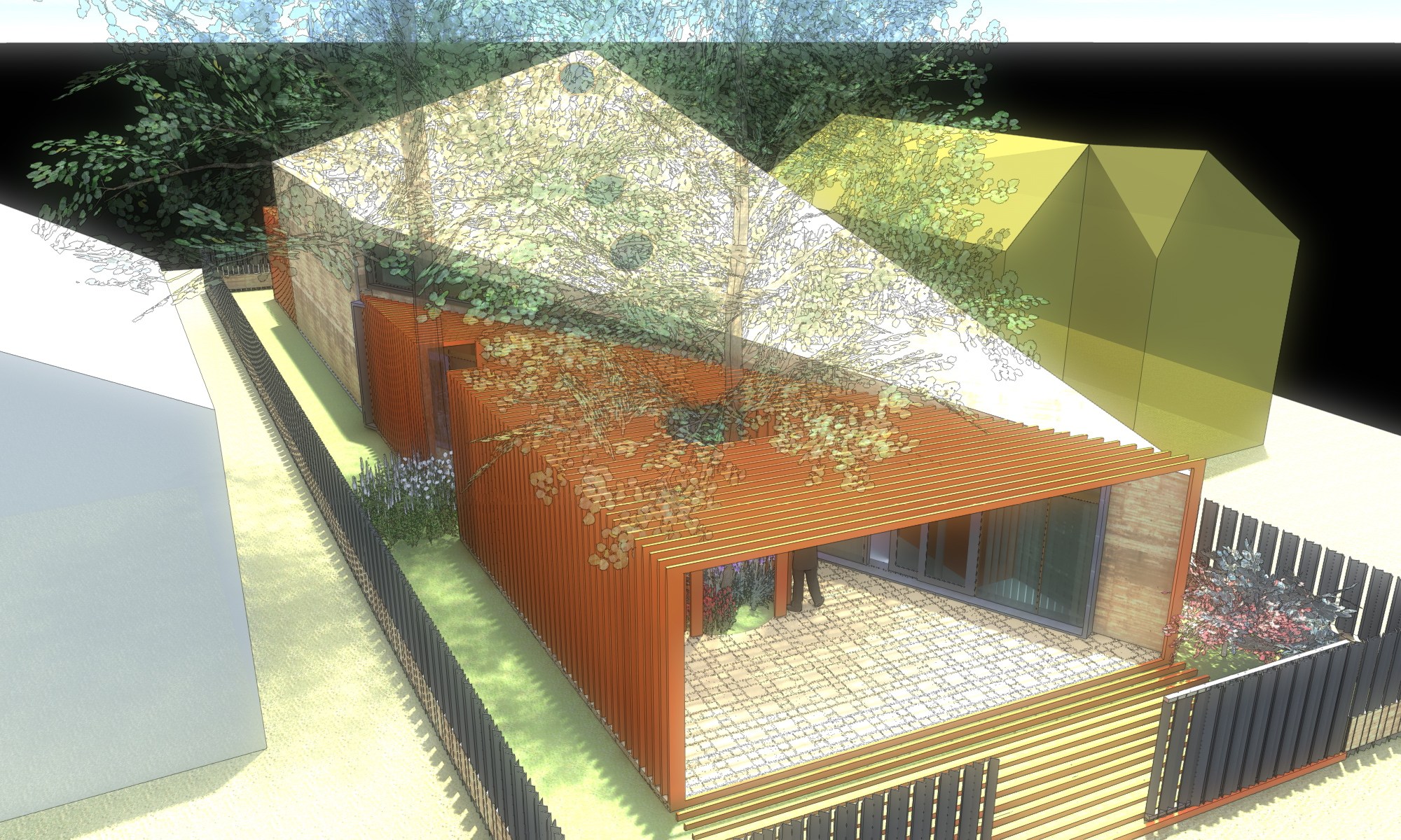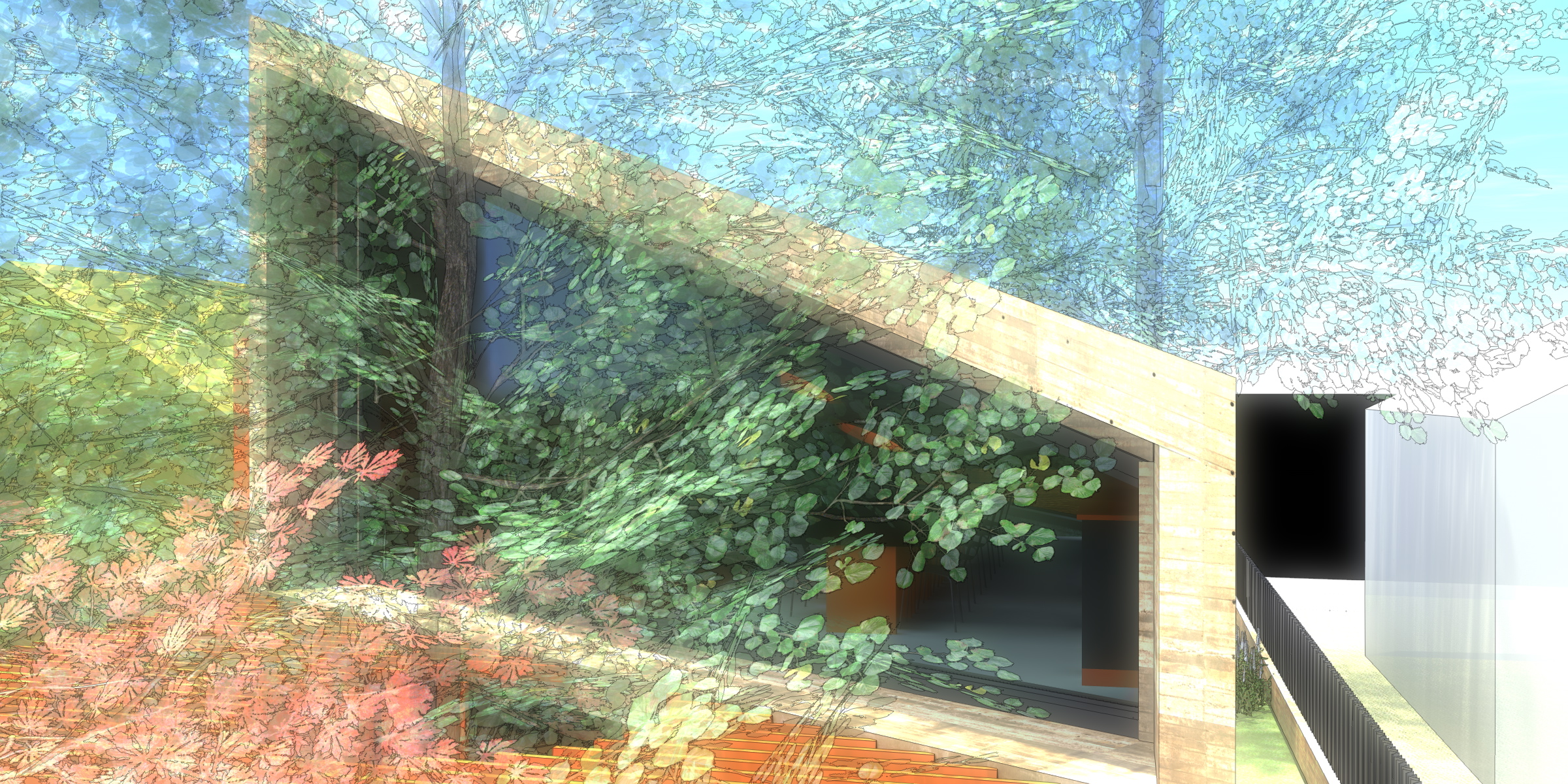 A su vez, los árboles están en medio de donde la normativa permite cosntruir, por lo que se adoptó un prisma que se transforma en una pérgola que genera el acceso a las oficinas, pero el volúmen de techos inclinados se conforma «esquivando» los árboles, y respetando a la naturaleza.