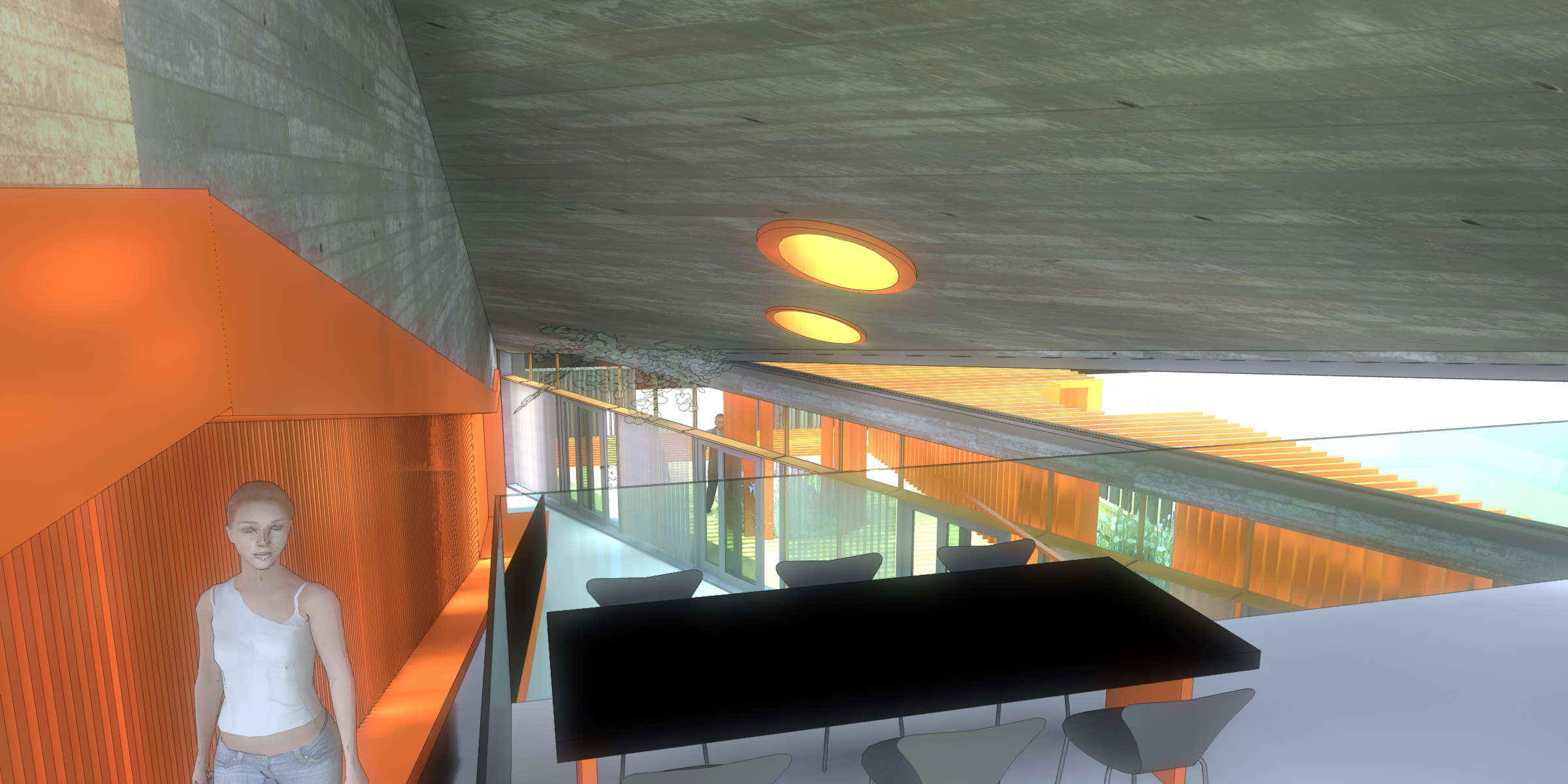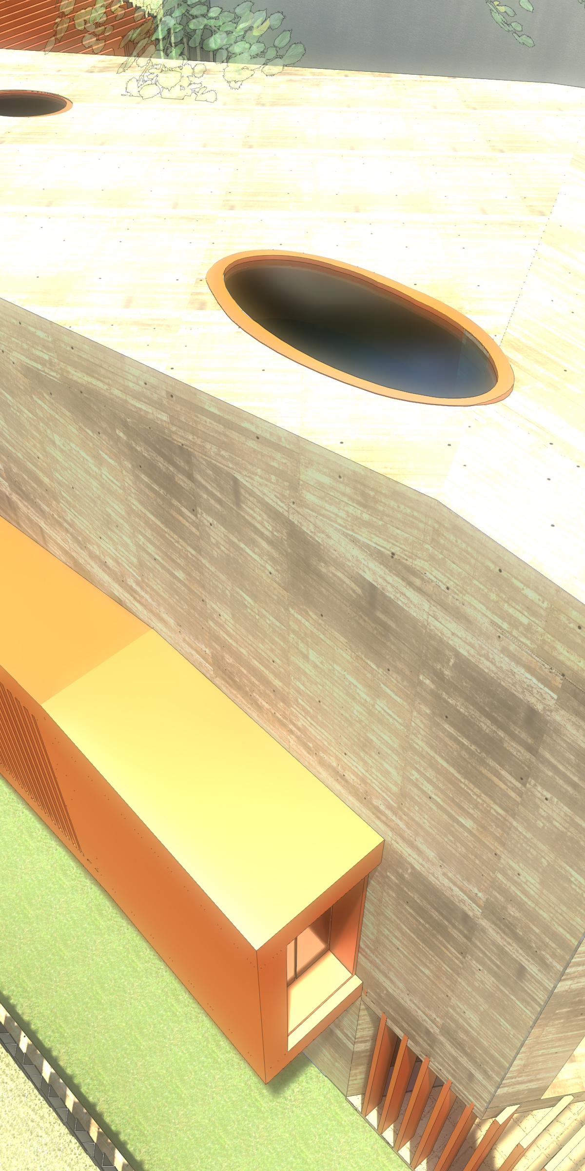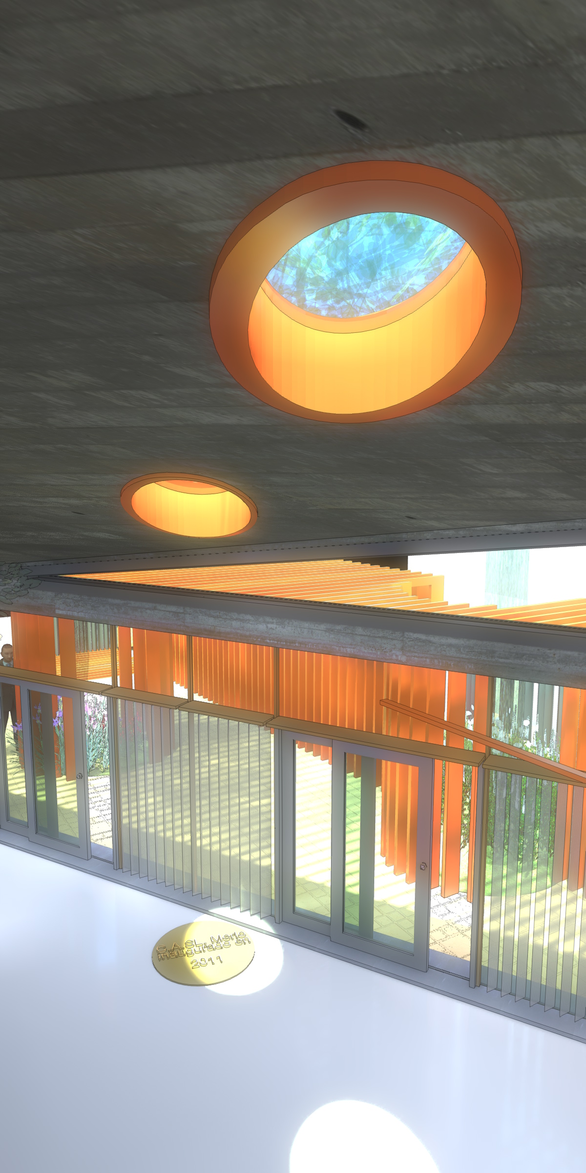 Los techos inclinados, generan una interesante volumetría, y se perforan para generar unos rayos de sol perfectamente estudiados para que el control de la luz solar sea el máximo, al estilo de los mejores arquitectos del antiguo Egipto. Las perforaciones del techo producen la iluminación en los solsticios de verano y de invierno y en los equinoccios, para que se ilumine una placa de bronce que está estratégicamente ubicada en el acceso del edificio. Como recordatorio que los arquitectos debemos controlar el espacio teniendo en cuenta los elementos naturales. Imaginaba que cada uno de estos días, se reunirían los colegas a brindar con una champange, la caída del sol en la placa… asadito de por medio…