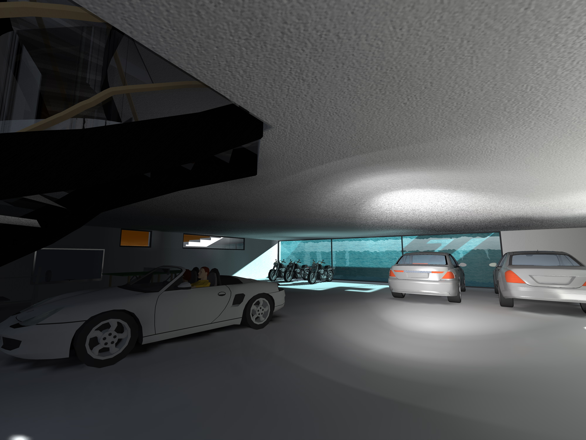 En el sótano, el cliente quiere un espacio para su colección de motos antiguas. También un GYM, y por supuesto el espacio para sus dos coches. Se ha agregado una ventana de cristal que soporta las presiones del agua de la piscina, y nos da una iluminación espectacular con los reflejos del sol atravesando el agua, y nos permite ver la gente nadando como si fuera una pecera.