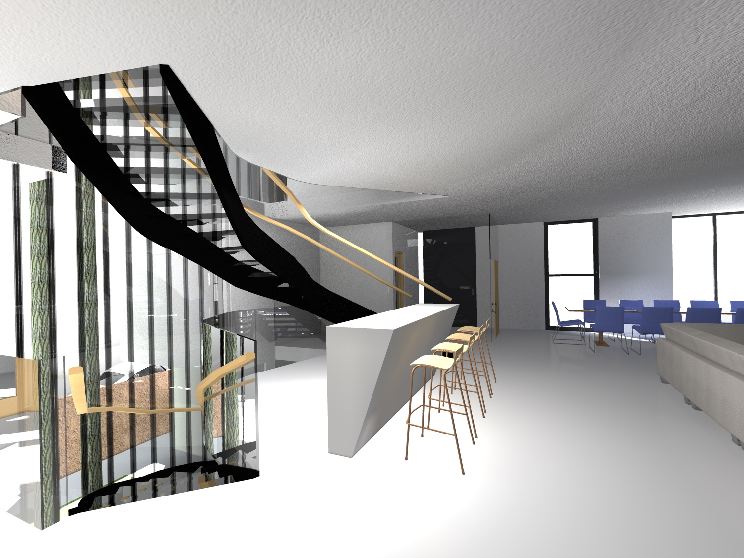 Se plantea una escalera con un formato original, ya que el cliente en principio quería una escalera un poco curvadao, más ancha abajo, al estilo antiguo de escalera en derrame. Se ha interpretado esta idea, y se la ha conformado de manera un poco más contemporánea.