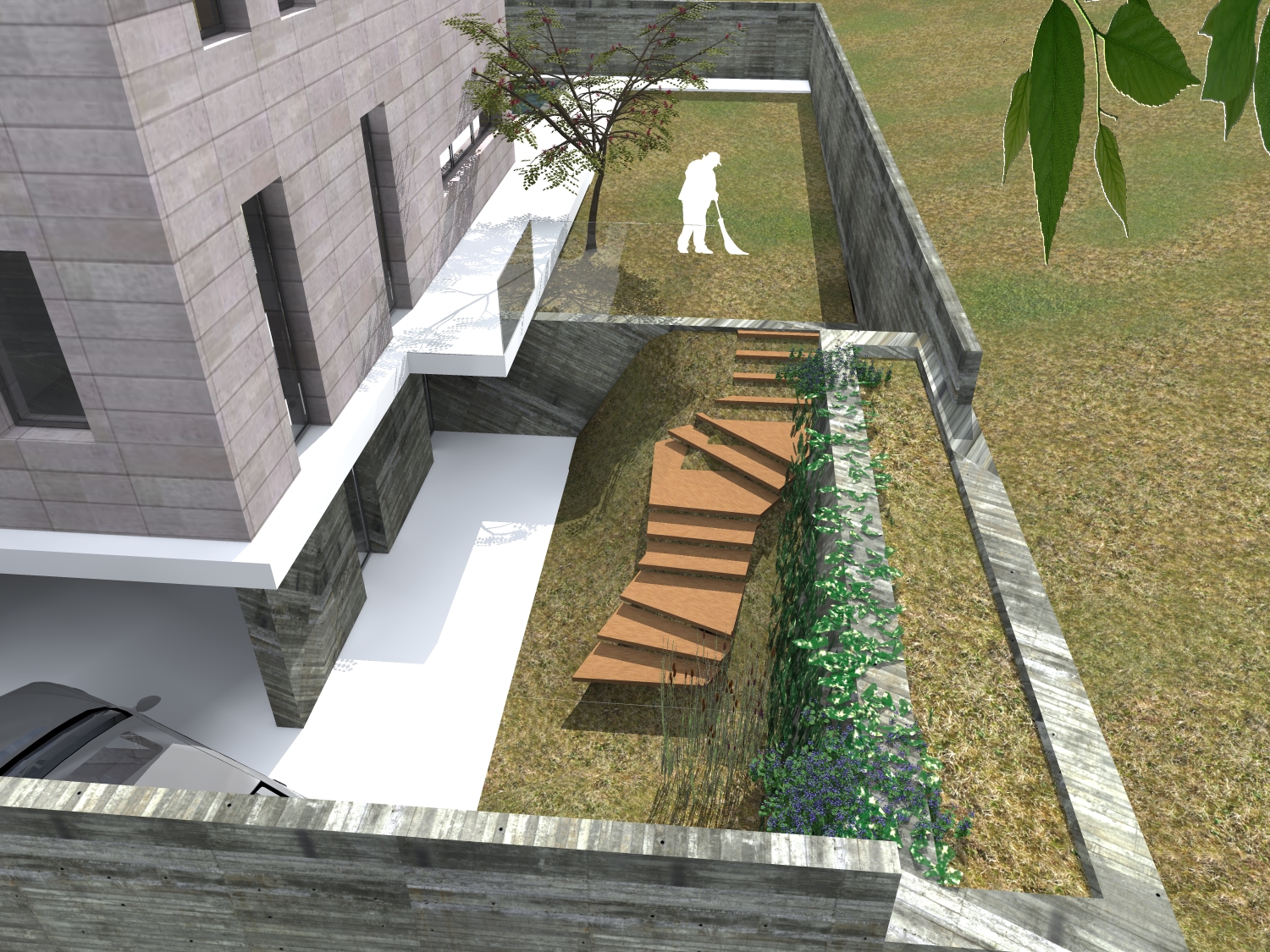 Detrás de la casa, se genera un patio inglés, o patio en el sótano que permite ventilación e iluminación natural en los espacios de subsuelo, permitiendo también generar una calle lateral para la rampa de acceso para los vehículos. Esta rampa culmina con un tratamiento del paisajismo con un talúd verde y plantas colgantes desde la medianera.