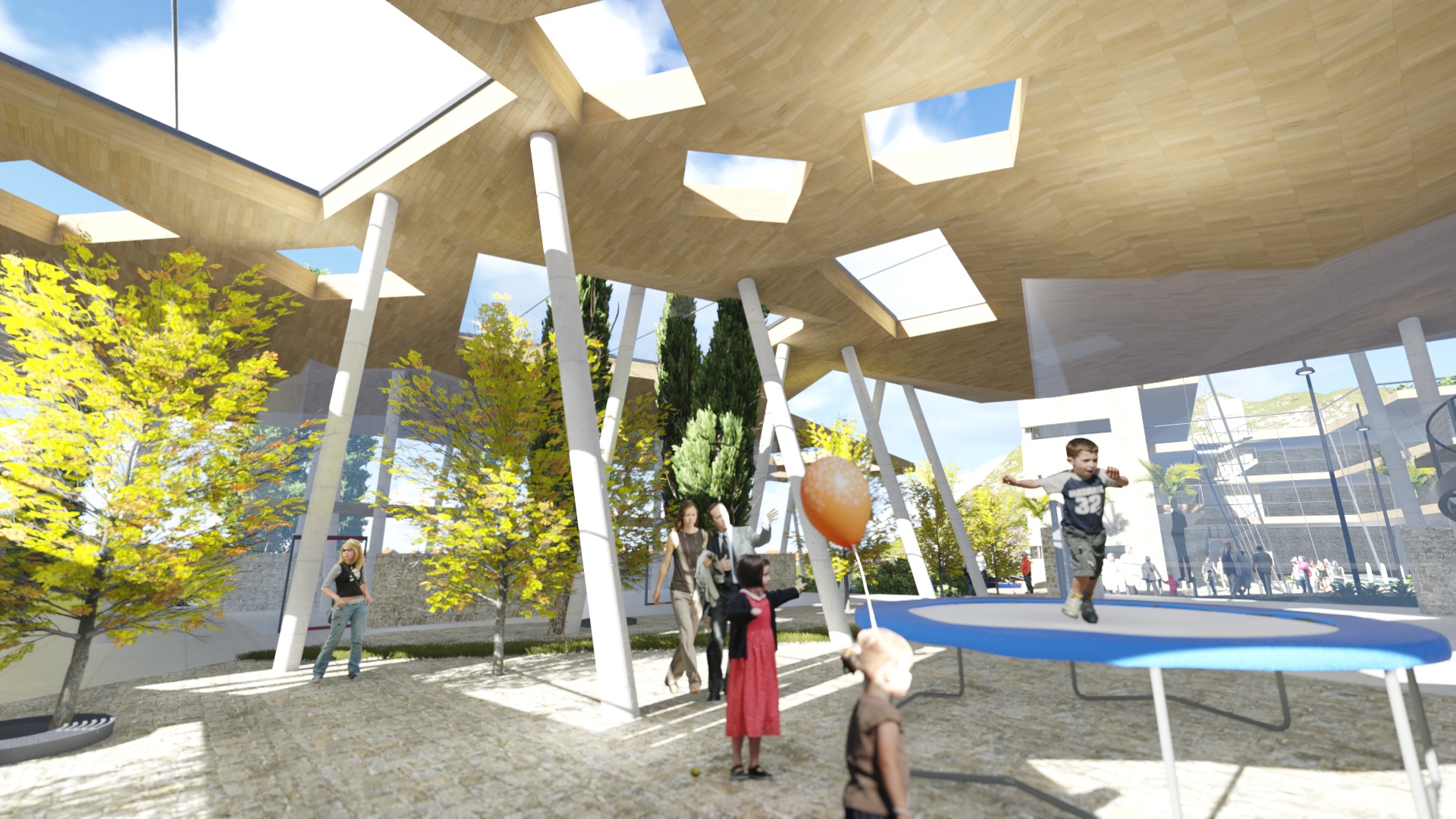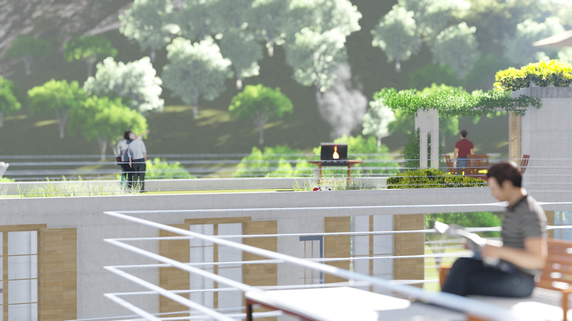 Aterrazando módulos funcionales, de tres tipologías, monoamiente, departamentos de un dormitorio y dúplex de dos dormitorios, acomodándolos como un «TETRIS» encastrándolos y rotándolos siguiendo la topografía. En la medida que vamos subiendo por una calle central, que divide (o une) el centro comercial con las viviendas, podemos acceder, sin necesidad de escaleras en gran parte del proyecto, a las distintas plantas, mediante «calles elevadas» que nos llevan a la puerta de los departamentos. Esto permite compartir espacios comunes elevados, y utilizarlos, apropiarlos como balcón propio. Esto permite sociabilizar, y disfrutar de espacios comunes que son muy diferentes a los clásicos pasillos de edificios. Con luz, con sol, con aire, pero protegidos por el techo del piso justo por encima.