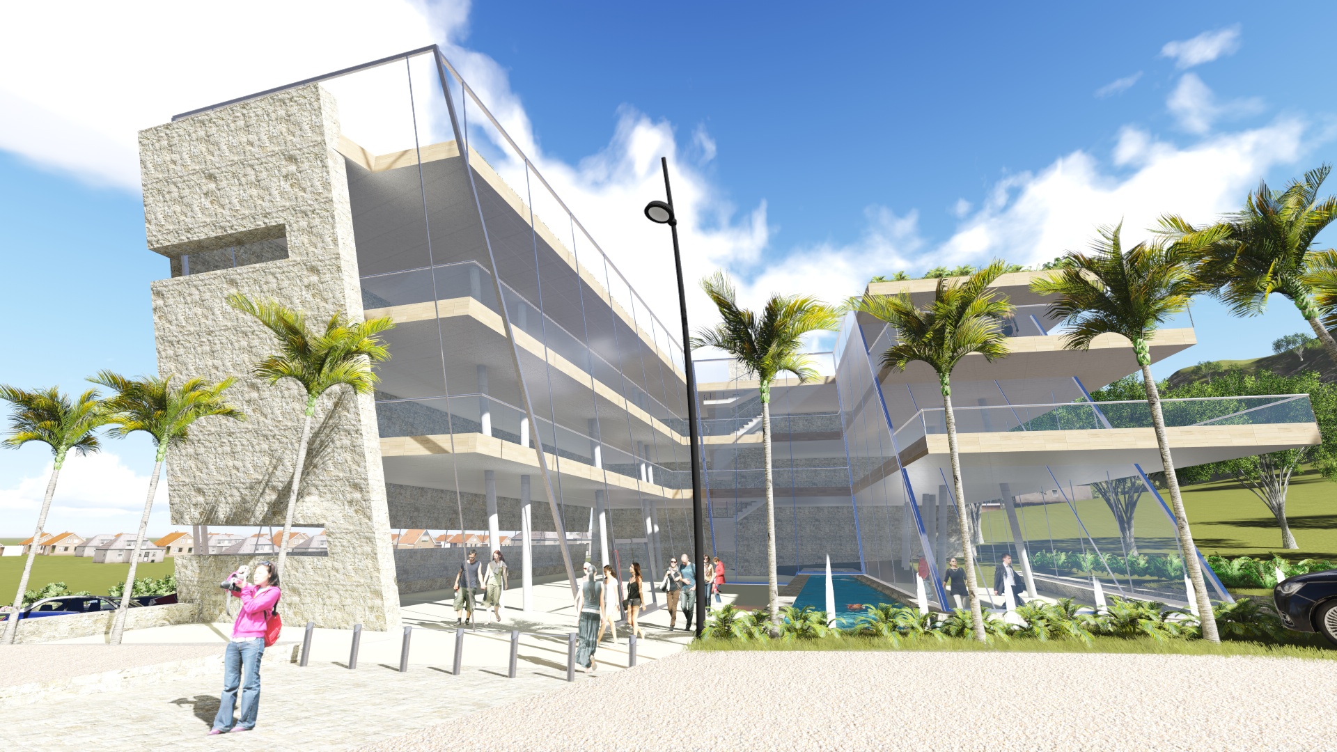 Se estudia la posibilidad de potenciar las inversiones mediante la ubicación de un supermercado como parte del proyecto, generando un polo de atracción. Este supermercado es parte integrante de la arquitectura, manteniendo un lenguaje similar al resto del proyecto. El Centro Comercial consta de un gran basamento de piedra, una gran muralla, aterrazada levemente, generando la imagen de pared de piedra en las sierras. El supermercado tendrá una lectura similar, y el edificio de oficinas, despegado hacia el Oeste, seguirá estos lineamientos. Pero en todos los casos se abren las visuales hacia las sierras, que coinciden con la orientación Norte.